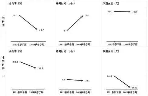 2021年秋季學期義務教育階段學生,參加非學科類校外培訓的比率為38.9%,與上學期相比下降了10.9個百分點。這一部分參加非學科類校外培訓的學生平均周用時3.8小時,比上學期少0.1小時;學期支出5600元,比上學期減少了728元。
