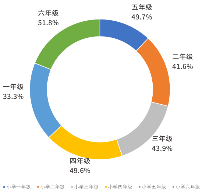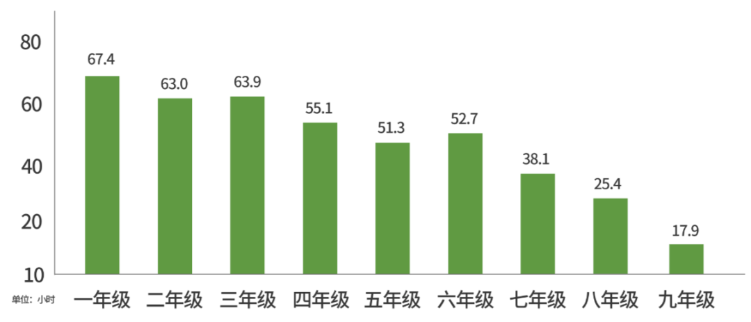 上圖數據為在“雙減”工作全面落實之前的2021年春季學期,學生課后完成書面作業的平均時間(單位:小時)。這顯然與小學一、二年級不布置家庭書面作業,小學三至六年級書面作業平均完成時間不超過60分鐘,初中書面作業平均時間不超過90分鐘的減負目標存在差距。