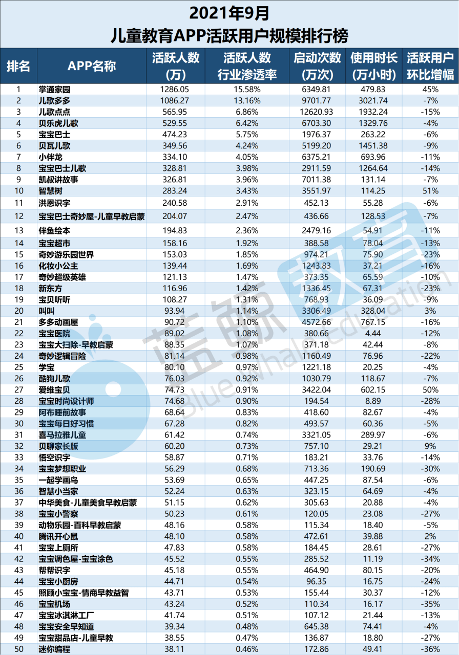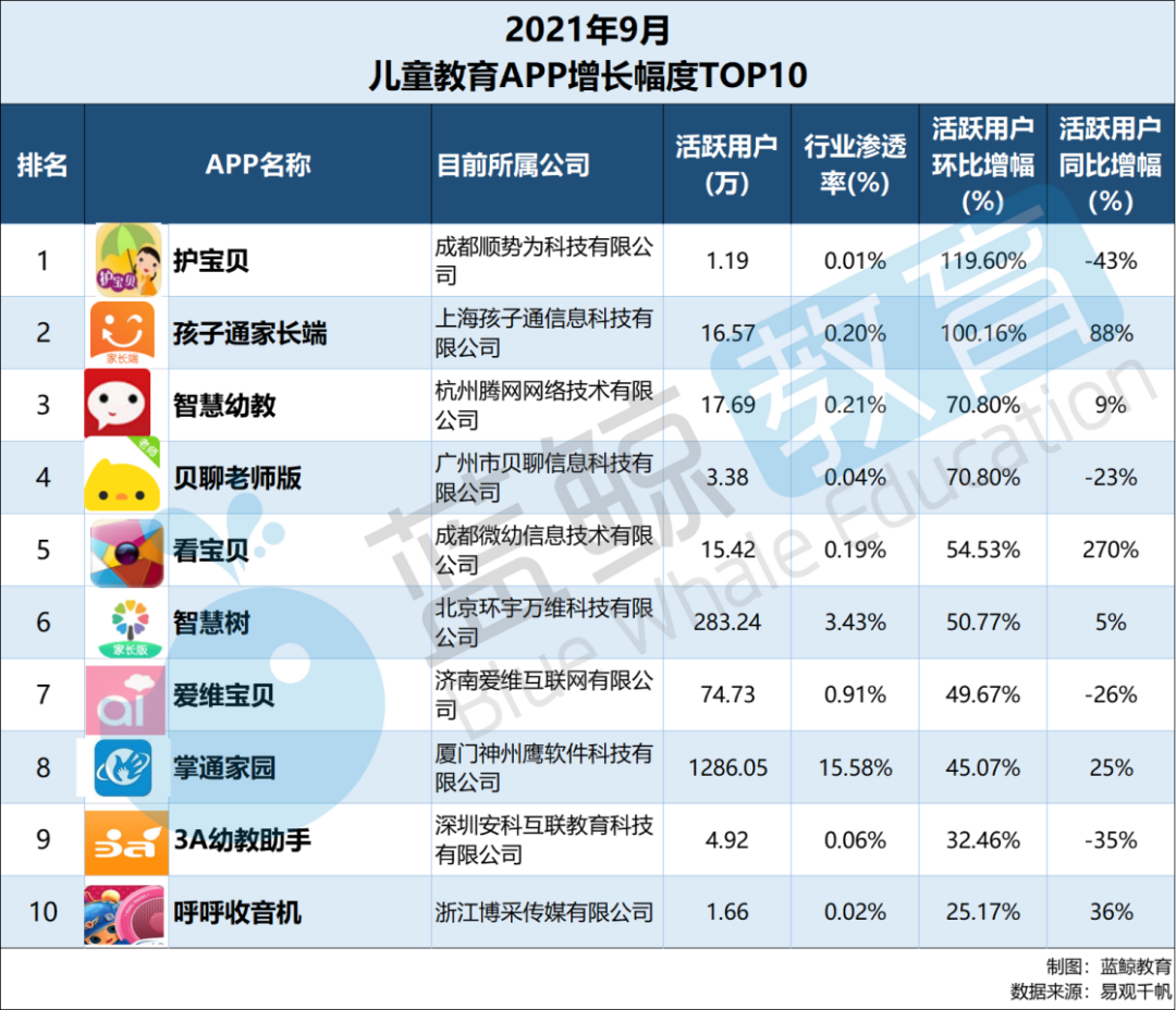 2021年9月末用戶(hù)增速前十的APP分別是:護(hù)寶貝、孩子通家長(zhǎng)端、智慧幼教、貝聊老師版、看寶貝、智慧樹(shù)、愛(ài)維寶貝、掌通家園、3A幼教助手、呼呼收音機(jī)。