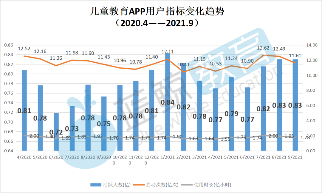 本次藍(lán)鯨教育智庫(kù)繼續(xù)聯(lián)合易觀千帆數(shù)據(jù)中心,為大家整理兒童教育賽道的發(fā)展趨勢(shì)。2021年9月末兒童教育APP共315家,活躍用戶(hù)約8253萬(wàn),占教育全網(wǎng)用戶(hù)比例16%,2021年8月末活躍用戶(hù)約為8331萬(wàn)。與2021年8月末相比,用戶(hù)規(guī)模數(shù)量減少78萬(wàn),環(huán)比增幅為-0.94%;9月末的啟動(dòng)次數(shù)達(dá)11.61億次,比8月末環(huán)比增幅為-6.99%;使用時(shí)長(zhǎng)約為1.78億小時(shí),比8月末環(huán)比增幅為-12.07%。總體來(lái)說(shuō),2021年9月末的活躍人數(shù)、啟動(dòng)次數(shù)和使用時(shí)長(zhǎng)三大數(shù)據(jù)較2021年8月末均出現(xiàn)小幅下跌。下圖是2020年4月末至2021年9月末,兒童教育APP的用戶(hù)指標(biāo)變化趨勢(shì):