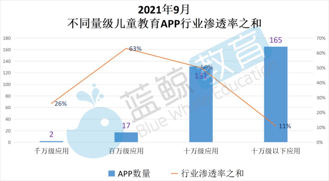 兩家千萬(wàn)級(jí)應(yīng)用“兒歌多多”和“掌通家園”領(lǐng)域滲透率為26%;17家百萬(wàn)級(jí)應(yīng)用領(lǐng)域滲透率高達(dá)63%;131個(gè)十萬(wàn)級(jí)用戶(hù)規(guī)模APP,用戶(hù)滲透率達(dá)50%,不及17家百萬(wàn)級(jí)應(yīng)用的滲透率;十萬(wàn)級(jí)以下應(yīng)用數(shù)量最多,領(lǐng)域滲透率之和最低,165家APP的領(lǐng)域滲透率之和僅11%。