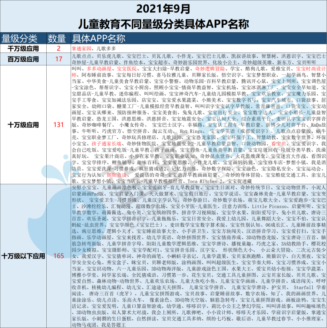 下面是2021年9月末不同量級(jí)分類(lèi)具體的APP名稱(chēng),供業(yè)內(nèi)人士查閱(標(biāo)紅的APP為該量級(jí)新增):