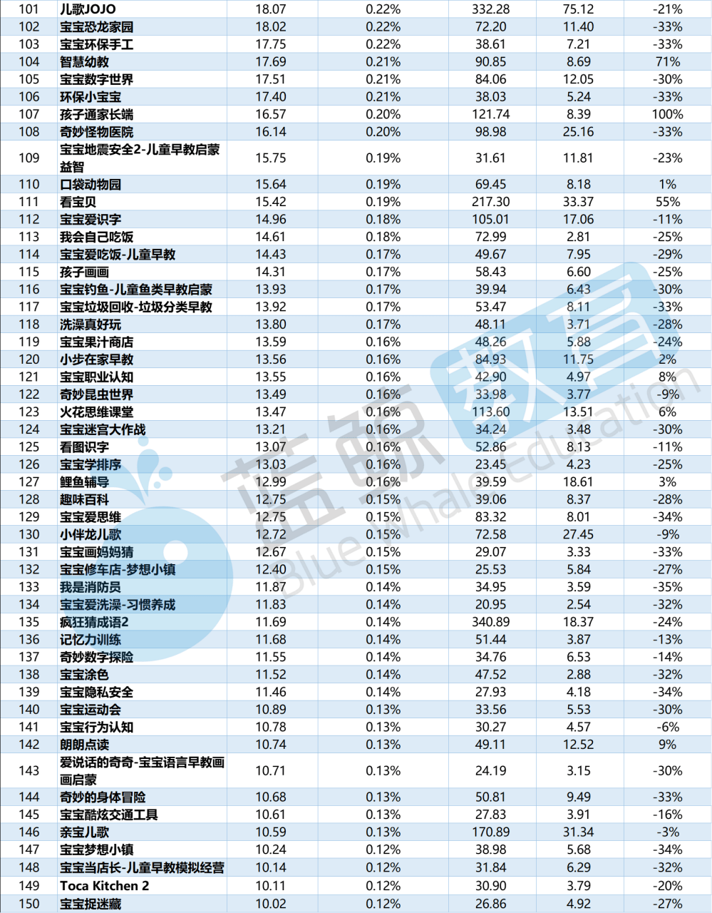 由于兒童教育賽道APP數(shù)量較多,所以下面只為大家展示在線兒童教育APP前150名的詳細(xì)排名,排名按照用戶(hù)規(guī)模排列,包括活躍人數(shù)、啟動(dòng)次數(shù)及使用時(shí)長(zhǎng)等維度數(shù)據(jù),供大家查閱: