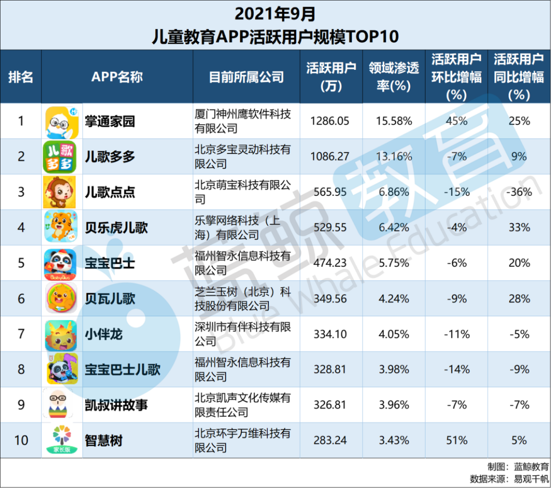 以下,我們來(lái)重點(diǎn)關(guān)注一下兒童教育APP活躍用戶(hù)規(guī)模TOP 10,進(jìn)入前十的APP有:掌通家園、兒歌多多、兒歌點(diǎn)點(diǎn)、貝樂(lè)虎兒歌、寶寶巴士、貝瓦兒歌、小伴龍、寶寶巴士?jī)焊琛P叔講故事、智慧樹(shù)。以下是這10家APP在2021年9月末的用戶(hù)規(guī)模,以及用戶(hù)規(guī)模的環(huán)比增長(zhǎng)和同比增長(zhǎng)情況(個(gè)別APP無(wú)2020年同期數(shù)據(jù),故標(biāo)為“-”):