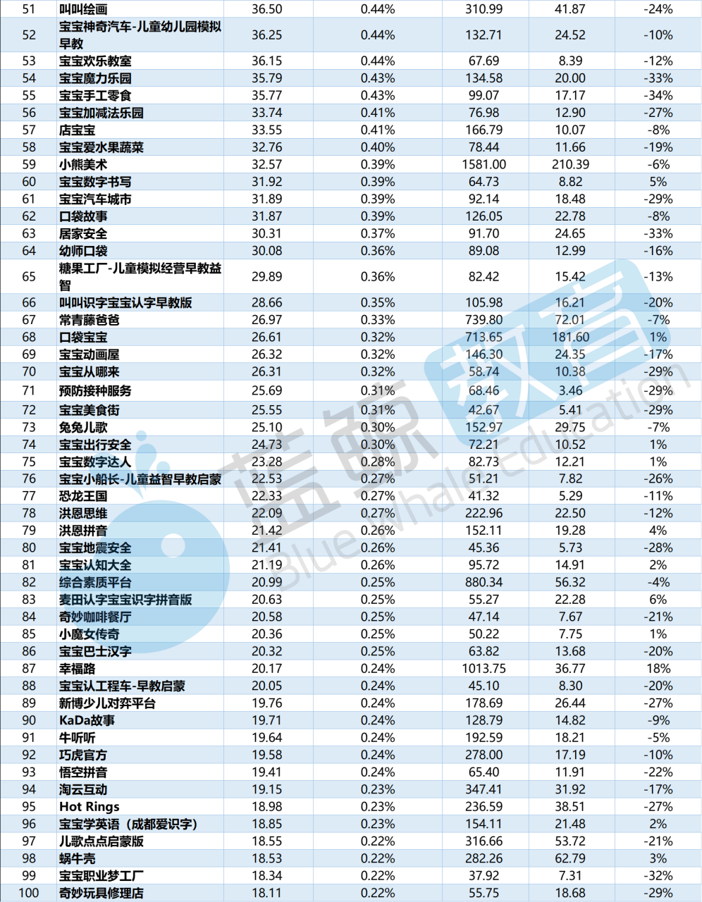 藍(lán)鯨教育智庫(kù)團(tuán)隊(duì),專(zhuān)注教育領(lǐng)域排行榜,會(huì)及時(shí)跟進(jìn)教育領(lǐng)域各賽道排行榜,每月月末市值排行榜,以及外語(yǔ)學(xué)習(xí)APP、中小學(xué)教育APP、職業(yè)教育APP等領(lǐng)域榜單,為大家梳理不同賽道的用戶(hù)數(shù)據(jù)走向,過(guò)往月份排行榜可查看《藍(lán)鯨商學(xué)院》公眾號(hào)。歡迎更多教育領(lǐng)域數(shù)據(jù)分析機(jī)構(gòu)與我們交流合作。