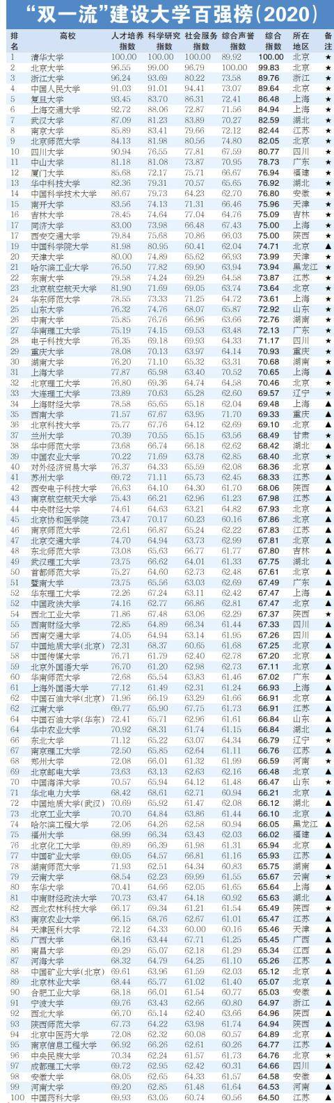 在2020年“雙一流”建設大學百強榜中,排名前十的高校分別是:清華、北大、浙大、人大、復旦、上交、武大、南大、北師大、川大。