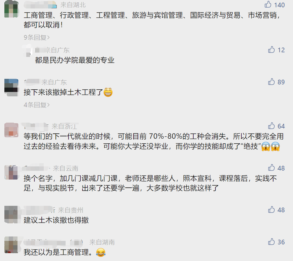 4月12日晚,話題#90所大學撤銷公共事業管理專業#登上微博熱搜。據媒體報道,在2015到2021年這7年時間里,共有90所大學撤銷了公共事業管理專業,引發關注。而在評論區,不少網友提出了他們認為可能被撤銷的專業:
