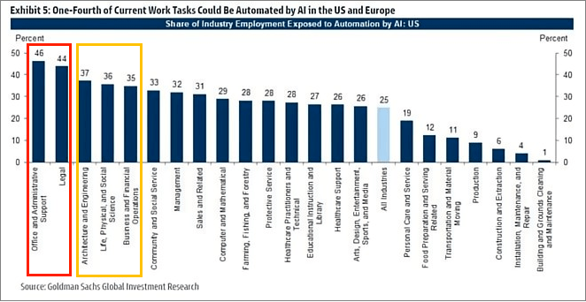 高盛集團于今年3月底發表的一份最新研究顯示,隨著AI技術對全球勞動力市場產生影響,預計多達3億個工作崗位或將被AI取代。在歐美,辦公室行政人員、法律工作者被替代風險最大,可被AI取代的工作比例超過40%;其后被替代風險較高的工作領域還有建筑與工程,生命、物理和社會科學,商務和財務運營等,可被AI取代的工作內容超過1/3。