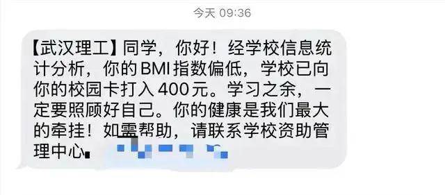 摘要: 原標題:太瘦了,學校給我發錢了,淚目 近日,有網友稱自己收到武漢理工大學發來的短信,提示學校已為他校園卡充值400元,并叮囑:學習之余,一定要