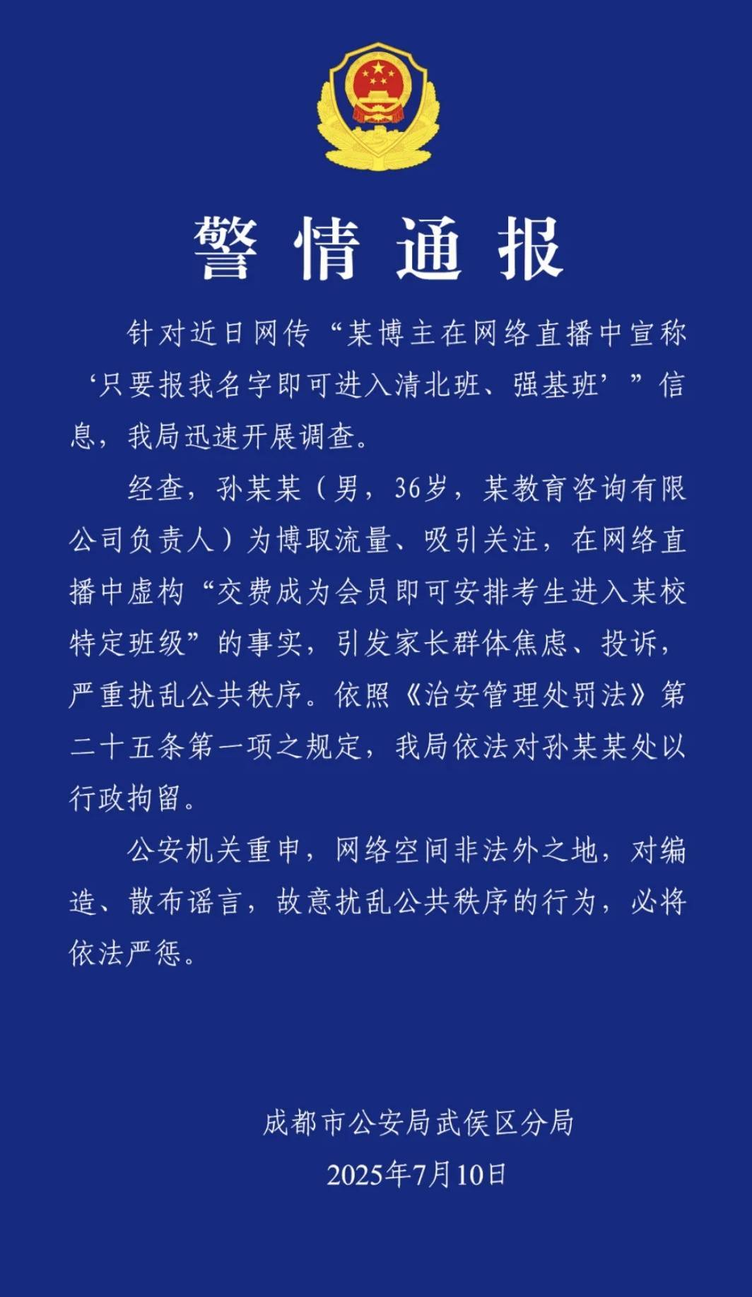 原標(biāo)題:成都某博主直播謊稱保送清北班,警方:拘!