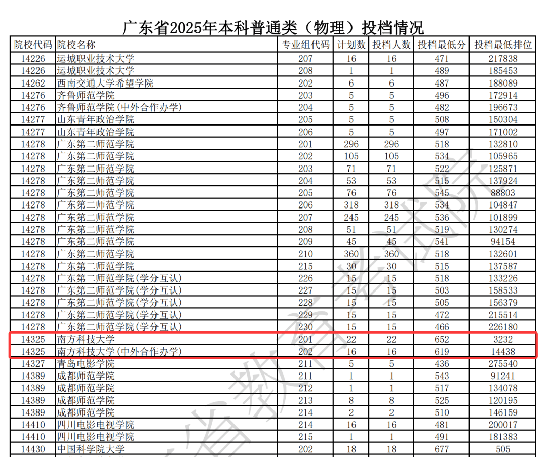 根據《廣東省2025年本科普通類(物理)投檔情況》信息顯示,南方科技大學201專業組投檔計劃22人,投檔最低分652分,投檔最低排名3232名;該校中外合作辦學的202專業組投檔計劃16人,投檔最低分619分,投檔最低排名14438名。其中201專業組的投檔分數或排名,高于武漢大學、南開大學、同濟大學、廈門大學、中山大學等多所老牌名校的部分專業組。