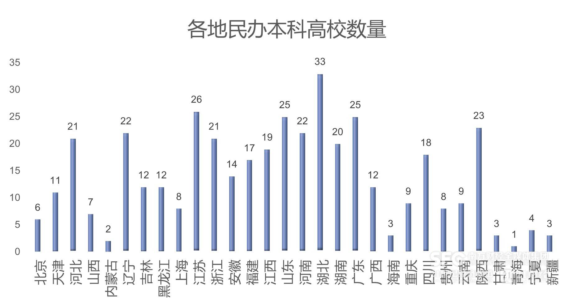 從分布來看,我國31個省份里除了西藏以外,每個省份都有民辦高校,分布相對均衡。湖北、江蘇、山東、廣東、陜西的數量靠前,分別有33、26、25、25、23所。