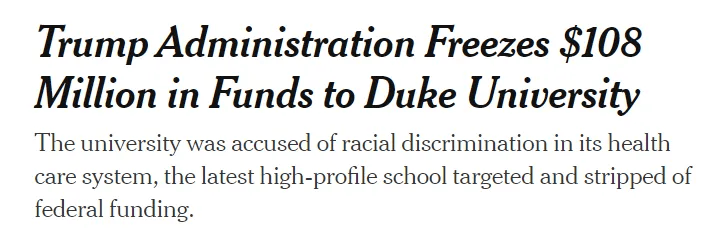 白宮以杜克大學(xué)的醫(yī)療系統(tǒng)存在“系統(tǒng)性種族歧視”為由,凍結(jié)了該校1.08億美元的聯(lián)邦資金,這一舉措引發(fā)了廣泛關(guān)注。