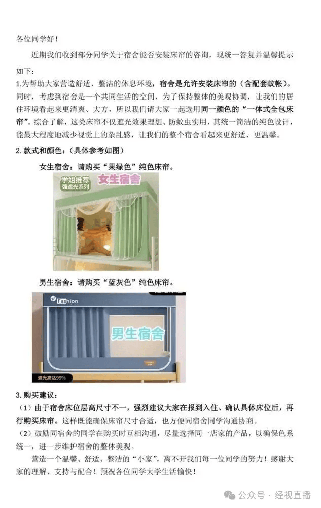 8月18日,發帖人向經視直播記者證實,其在新生群收到上述提示,咨詢輔導員后得到“女生可買遮光性一體式綠色床簾”的回復。之后,記者以新生身份聯系該校招生辦,工作人員表示,宿舍床簾安裝無統一要求,學生可自愿選擇裝或不裝。不存在“男生藍色、女生綠色”的強制規定,新生可忽略群內關于“格調統一”的建議。