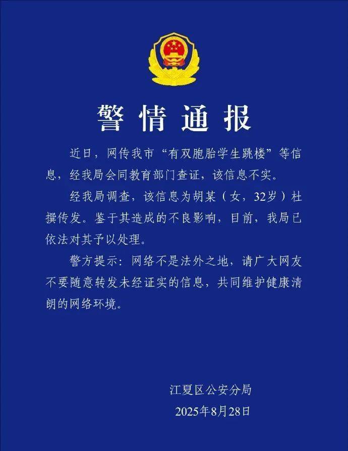 今天(8月28日),武漢江夏區(qū)公安局發(fā)布通報稱,經(jīng)該局會同教育部門查證,該消息不實。經(jīng)調(diào)查,該信息為胡某(女,32歲)杜撰傳發(fā)。鑒于其造成的不良影響,目前,該局已依法對其予以處理。