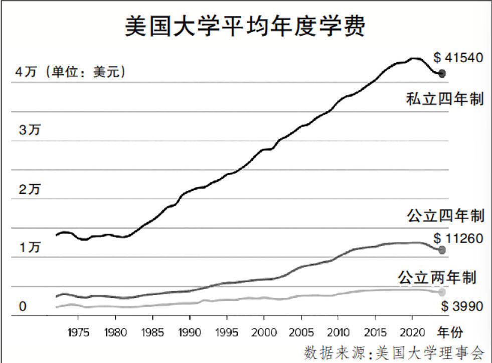 “隨著秋季學期臨近,美國大學高昂的費用正成為大多數學生的沉重負擔。”美國CNBC網站8月的一篇報道援引美國公民金融集團最新調查顯示,盡管59%的家長在孩子被美國大學錄取時對支付學費充滿信心,但當學費賬單抵達后,這一比例驟降至21%,暴露出巨大的“信心落差”。數據顯示,近年來,美國大學費用持續攀升。摩根大通資產管理報告顯示,自1983年以來,美國大學學費年均上漲5.6%,遠超通脹率。據統計,越來越多美國大學年學費接近或突破10萬美元大關,且仍以每年約5%的速度增長。
