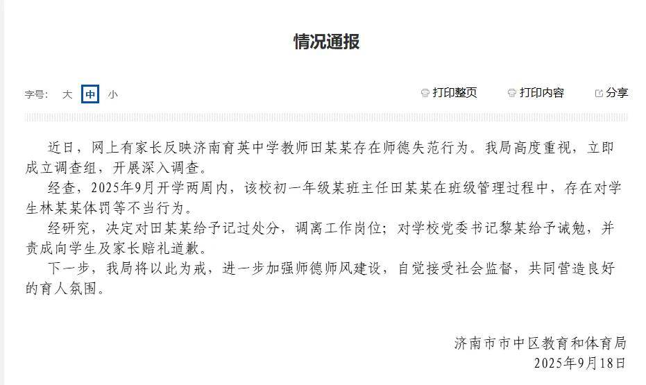 事情曝光后,全網震怒。9月18日晚,濟南市市中區政府火速發布通報:經查,田某某在開學兩周內就對初一學生林某某實施體罰等不當行為。最終處理結果:田某某被記過并調離崗位,學校黨委書記被誡勉。