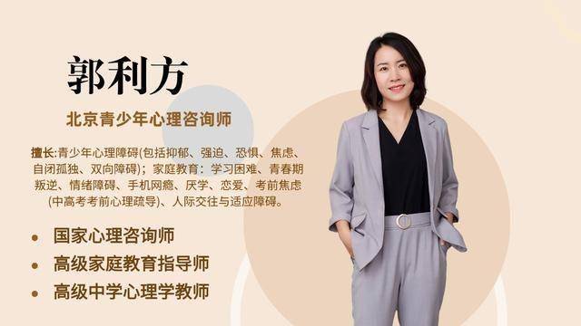 主講人:北京著名青少年心理咨詢師郭利方,國家心理咨詢師、家庭教育指導(dǎo)師;畢業(yè)于中國政法大學(xué),具有心理學(xué)、社會學(xué)、教育學(xué)多重背景,自2008年攻讀心理學(xué),多年的學(xué)習(xí)精神分析,認(rèn)知行為治療及家庭治療,擅長于各類型兒童青少年心理問題,生涯規(guī)劃和人際關(guān)系.對于治療驚恐發(fā)作及焦慮抑郁經(jīng)驗豐富。