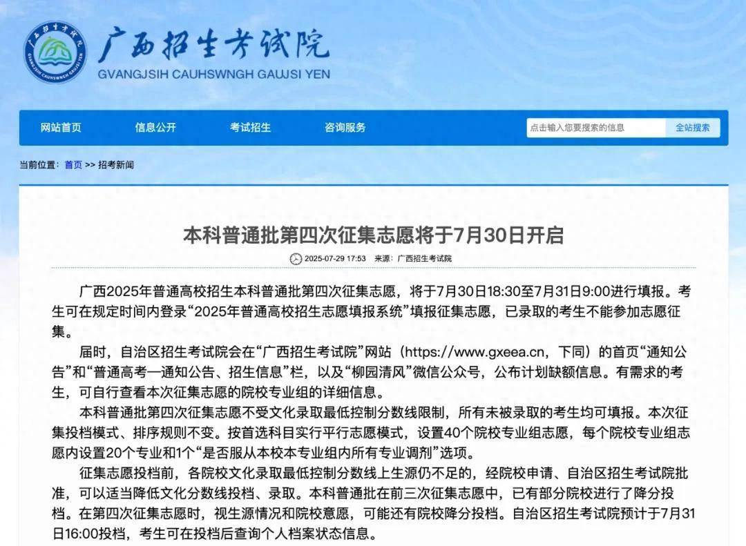 日前,廣西本科開始第四次征集志愿,即第四次補(bǔ)錄。如果算上常規(guī)錄取,這已經(jīng)是本科第五輪錄取了。在第四次征集志愿中再次強(qiáng)調(diào) 不受文化成績最低錄取分限制,所有未被錄取同學(xué)均可填報。