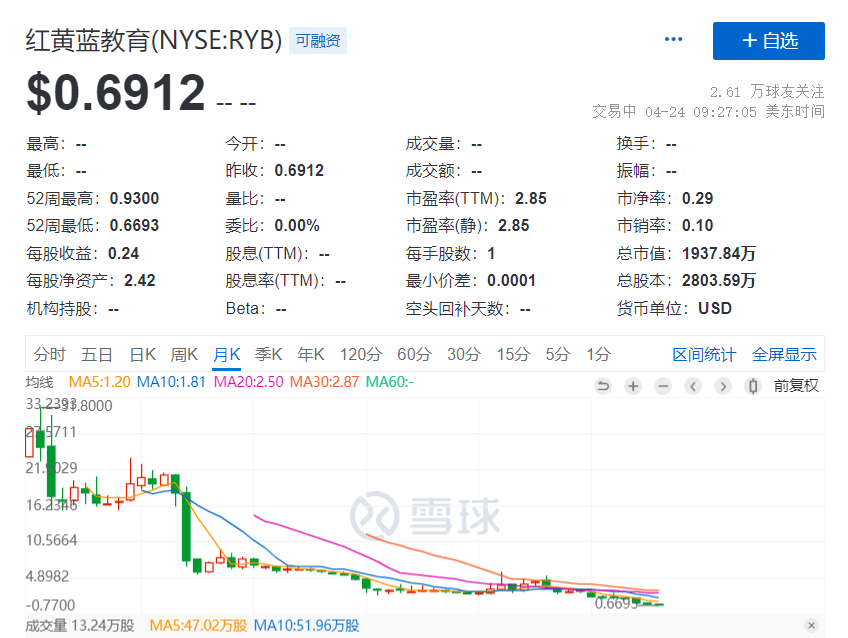 紅黃藍本是幼教明星股,2017年9月在紐交所上市。上市初,幼教行業正處于“黃金時代”,深受資本追捧,秀強股份、威創股份等上市公司都紛紛將幼教作為跨界轉型的方向。