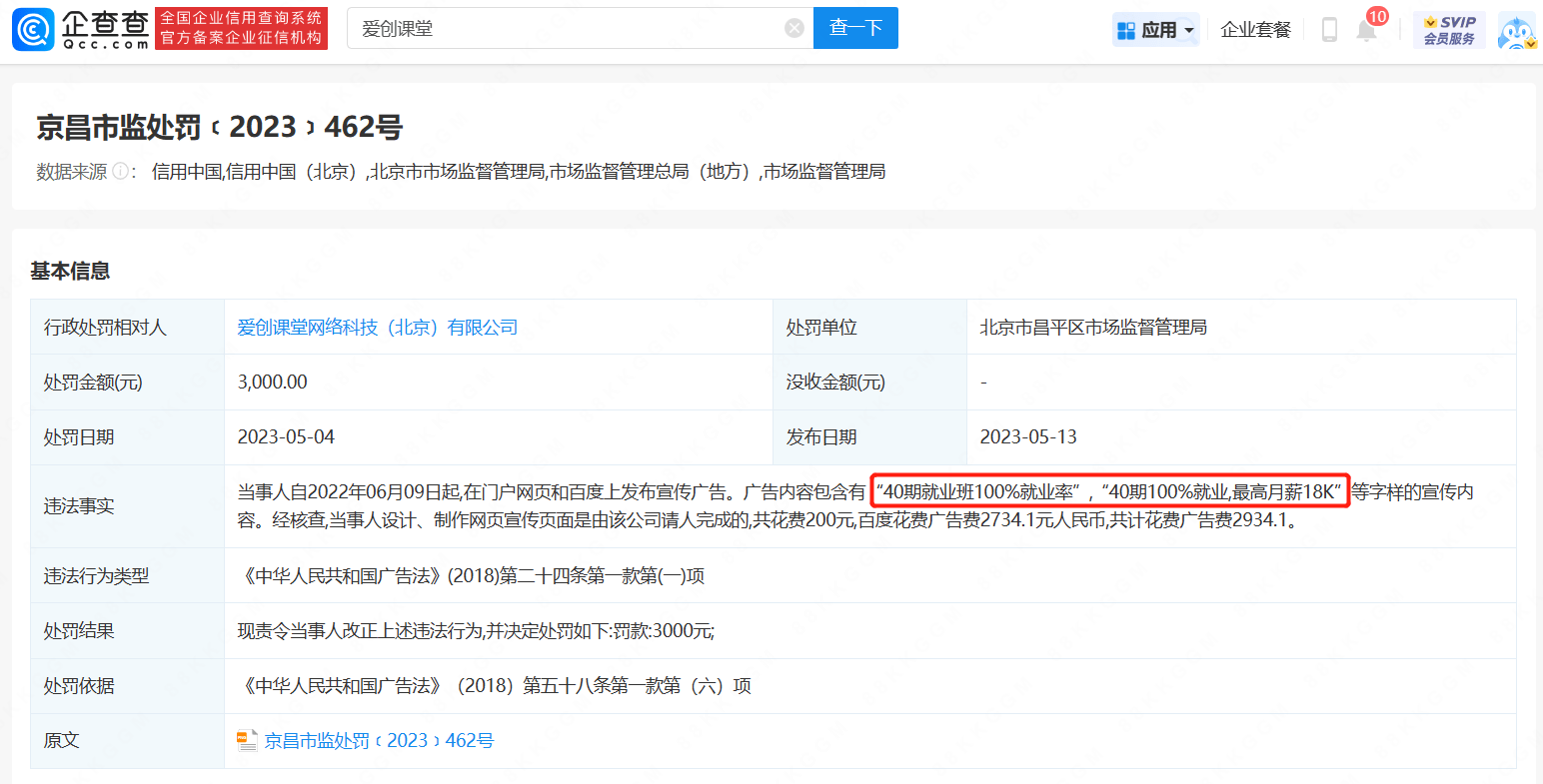 企查查APP顯示,近日,愛(ài)創(chuàng)課堂網(wǎng)絡(luò)科技(北京)有限公司因違反廣告法被北京市昌平區(qū)市場(chǎng)監(jiān)督管理局罰款3000元。處罰詳情顯示,該公司的廣告內(nèi)容包含有“40期就業(yè)班100%就業(yè)率”,“40期100%就業(yè),最高月薪18K”等字樣的宣傳內(nèi)容。公開(kāi)信息顯示,愛(ài)創(chuàng)課堂是一家前端培訓(xùn)機(jī)構(gòu),主要業(yè)務(wù)為培訓(xùn)前端工程師。
