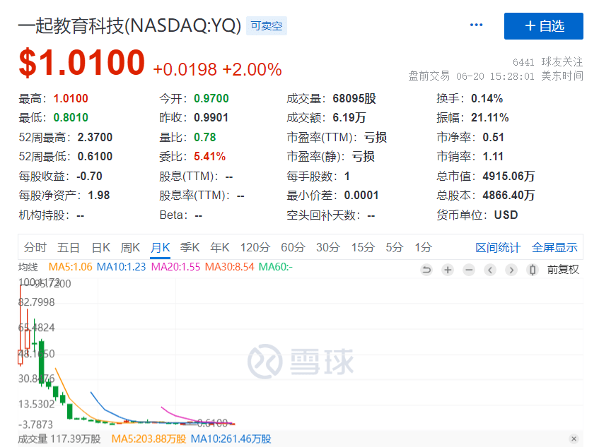 與此同時,由于業績的持續下滑,一起教育的融資通道也在一步步收緊。本年度,一起教育的股價再度縮水,目前其股價再次徘徊在1美元的警戒線上,這樣的股價水平,不但融資難度在增加,甚至其上市公司的資格可能也會受到挑戰。