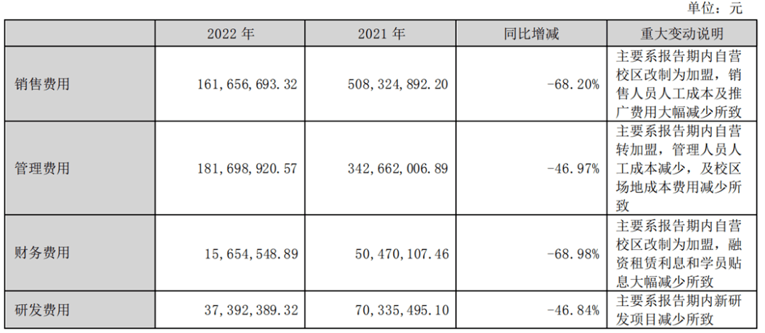 據財報披露,改制后開元教育,成本費用較上年同期明顯下降,2022年公司營業成本較2021年下降39.89%,銷售費用較上年同期下降68.20%,管理費用較上年同期下降46.97%。