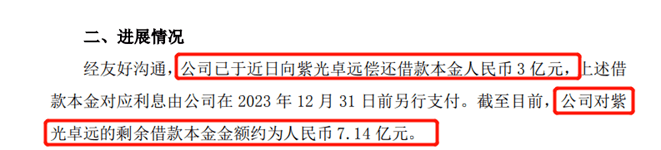 月初,學(xué)大教育剛剛還完對(duì)芯鑫保理的1.01億借款。7月10日,學(xué)大向紫光卓遠(yuǎn)償還借款本金3億元,目前,剩余借款本金金額約為7.14億元。