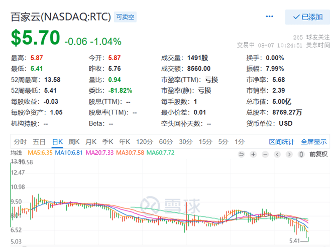 8月4日,百家云股價報收5.76美元,大跌13.38%,刷新了上市以來的歷史新低。