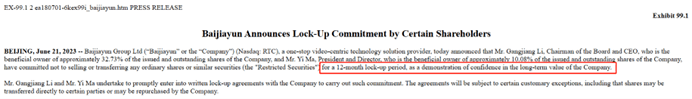 與此同時,在今年6月,百家云發(fā)布公告稱,基于對公司未來發(fā)展的信心及支持公司長遠(yuǎn)健康發(fā)展的初心,同時為維護(hù)公司價值及股東權(quán)益,百家云集團(tuán)董事長李鋼江及百家云集團(tuán)總裁馬義宣布作出鎖定承諾,并簽署書面鎖定期協(xié)議。
