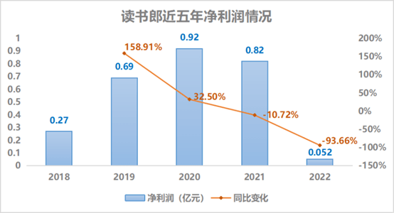而在今年4月,讀書郎發布的上市后首份年報,同樣出現了不小的滑坡。2022年,讀書郎營收共計6.05億元,同比減少了約25.6%,連續4年的上漲態勢就此中斷。與此同時,公司實現歸母凈利潤520.9萬元,同比減少94%。這一利潤表現,已降至2018年以來的最低水平,甚至不足原本的年度凈利潤最低值的零頭。
