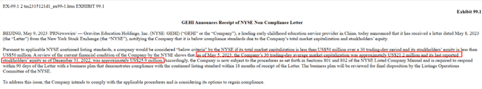 但在今年5月9日,其再度收到紐交所警示函稱,其總市值和股東權益低于合規標準。公告稱,截至2023年5月5日,公司30個交易日的平均市值約為2120萬美元,截至2022年12月31日,其最后一次報告的股東權益約為2590萬美元,這兩項指標均低于5000萬美元的要求。紐交所要求其在90天內提交一份商業計劃,證明其符合持續上市標準。