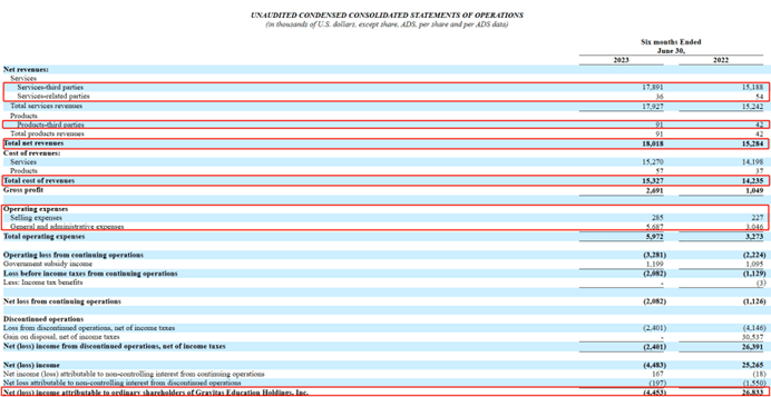 在營收、費用同步增長情況下,啟今教育的利潤水平也出現波折。上半年,其歸屬于普通股東的凈虧損為450萬美元,而2022年同期為凈利潤2680萬美元,同比由盈轉虧。按照經營虧損的數據看,其上半年歸屬于普通股東的持續經營虧損為220萬美元,而2022年同期為110萬美元,同比擴大。