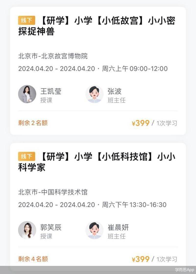 北京商報記者在學而思App上看到,目前,學而思推出的研學項目大多數為單日營,按次收費,單次收費為269—499元不等。銷售渠道包括學而思App、小程序及抖音賬號“學而思研學直播間”。具體到產品來看,學而思研學產品的目的地包括了各類博物館及各地的標志性景點。帶隊老師則是有過授課經驗的學而思老師。