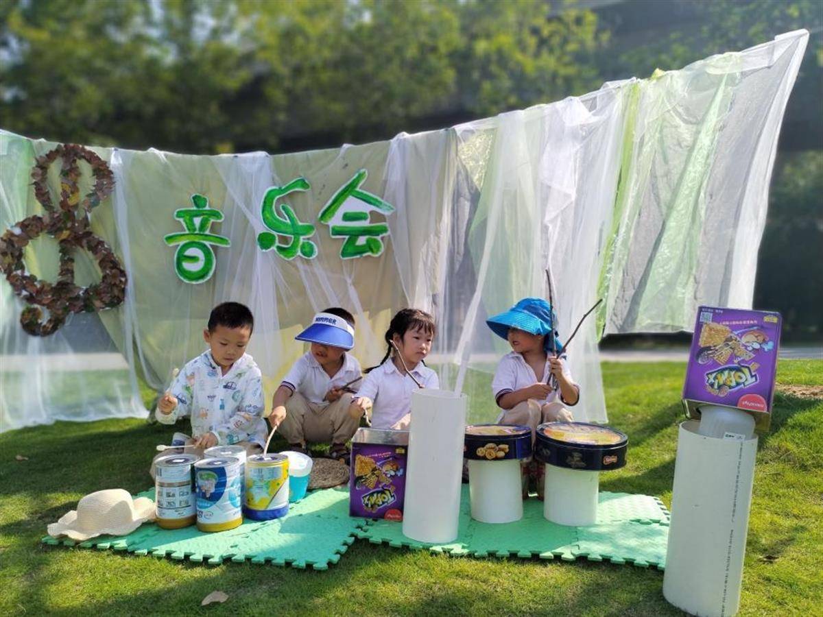 “你用樹枝當(dāng)鼓槌,我們兩個一起來敲鼓”“好??!嘟嘟,我們倆一起敲架子鼓”……鐵盒做鼓,樹枝做鼓槌,牛奶罐做鼓架,一場公園音樂會要開始演奏了。