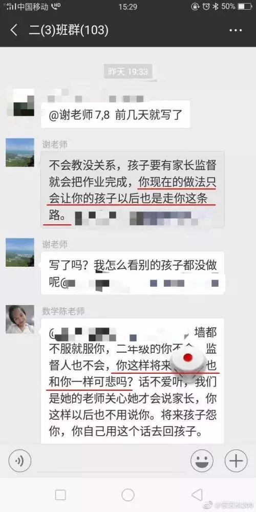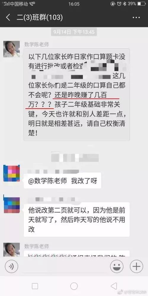 10月11日,江西吉安井岡山經開區學校幾名家長,因未批改作業被老師在家長群里點名批評:“昨晚賺了幾百萬?”“你這樣將來你的孩子和你一樣可悲!”