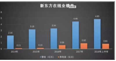 結(jié)合新三板的報(bào)表,獨(dú)角獸早知道整理了其2014—2018年上半年的業(yè)績(jī)后發(fā)現(xiàn),不同于其他的在線教育行業(yè),要么虧損要么增收不增利。新東方在線有兩個(gè)值得關(guān)注的點(diǎn),一是增收增利,二是維持較高的毛利率和凈利率,分別在67%和20%左右。