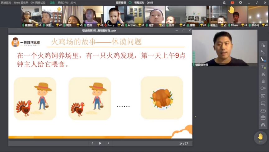 例如,在圖形推理課上,在教完傳統(tǒng)的根據(jù)圖形、數(shù)字規(guī)律推導(dǎo)出結(jié)論后,一休數(shù)學(xué)思維引入了一個(gè)火雞場(chǎng)的故事:一只火雞科學(xué)家總結(jié)歷史規(guī)律,得出“主人每天早上會(huì)來(lái)給大家喂食”的結(jié)論,但它在感恩節(jié)公布這條規(guī)律時(shí),主人不但沒(méi)有投食、反而殺了這群火雞,以此引出哲學(xué)史上著名的“休謨問(wèn)題”,啟迪孩子所有的知識(shí)、結(jié)論都是在一定的限定條件下才成立的,歸納法是不夠嚴(yán)謹(jǐn)?shù)摹⒉灰患扔兄R(shí)、思路固化思維,從而培養(yǎng)孩子批評(píng)性思維、進(jìn)而通過(guò)親子互動(dòng)培養(yǎng)孩子創(chuàng)新性思維。