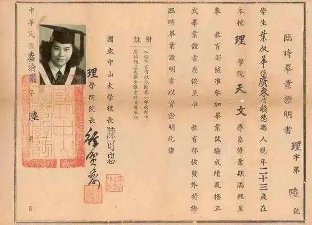 于是,她以第一名的成績(jī)考上了中山大學(xué)數(shù)學(xué)天文系。那時(shí)候的中山大學(xué),數(shù)學(xué)系和天文系是合辦的,所有學(xué)生在入學(xué)之初都要學(xué)習(xí)一門天文課。