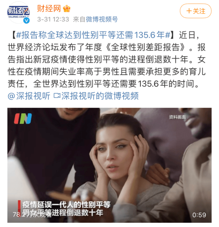 世界經(jīng)濟(jì)論壇發(fā)布的《2021全球性別差距報(bào)告》顯示,在過(guò)去的一年里,我國(guó)勞動(dòng)參與率、立法者中的女性人數(shù)、部長(zhǎng)級(jí)女性人數(shù)等政治經(jīng)濟(jì)參與排名略有下降。新冠疫情期間女性失業(yè)率高于男性,且需要承擔(dān)更多的育兒責(zé)任。全球?qū)崿F(xiàn)男女平等還需花費(fèi) 135.6年的時(shí)間。