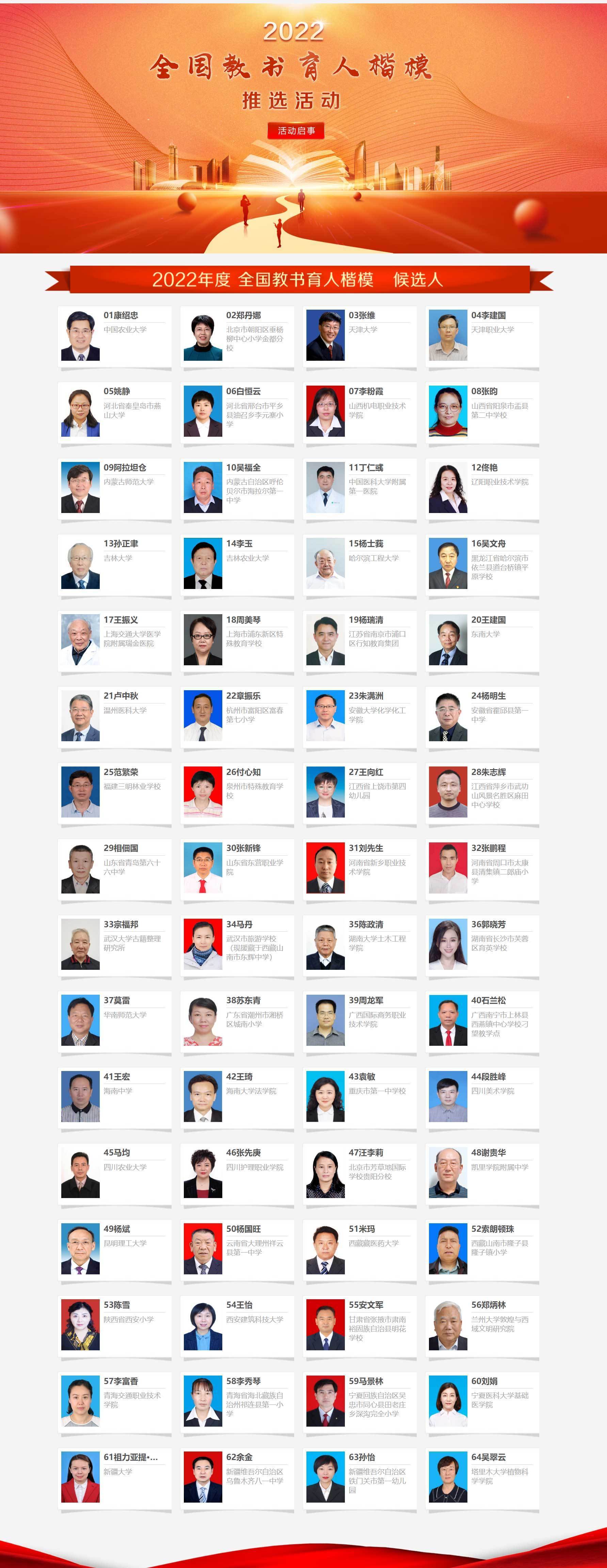 推選委員將會根據(jù)公示反饋和實際情況,從64名候選人中推選出10名全國教書育人楷模。
