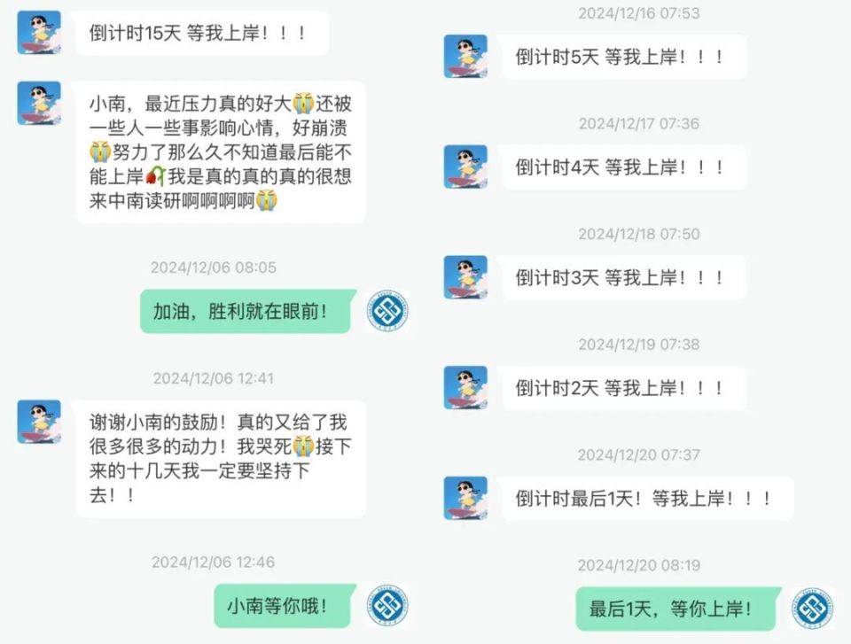 在考研最后的100天里,有位女孩每天早上七八點都會在中南大學官微后臺留言同樣一句話:“倒計時XX天,等我上岸!”