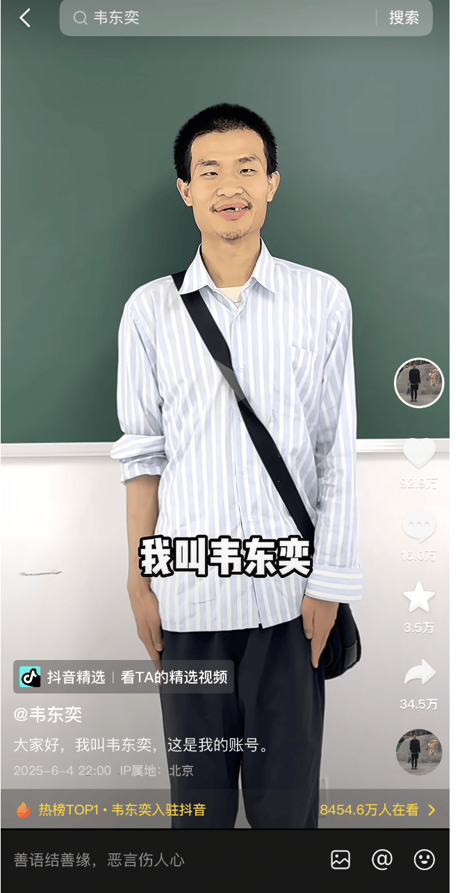 近日,被網(wǎng)友時(shí)常稱為“韋神”的北京大學(xué)數(shù)學(xué)科學(xué)學(xué)院助理教授韋東奕,在抖音平臺(tái)開設(shè)了個(gè)人賬號(hào),名為“韋東奕”,并發(fā)布了一則4秒短視頻。視頻中,韋東奕身著標(biāo)志性藍(lán)白條紋襯衫,站在黑板前以極簡方式介紹:“大家好,我叫韋東奕,這是我的賬號(hào)。”這則看似普通的視頻迅速引發(fā)網(wǎng)友圍觀和點(diǎn)擊——截至6月6日17時(shí),賬號(hào)粉絲數(shù)從最初的1000余人暴漲至250.1萬,唯一的一條作品視頻點(diǎn)贊量已突破90萬,評(píng)論區(qū)涌入超16萬條留言,并秒變“高考許愿池”,大量考生、家長留言“沾喜氣”“求數(shù)學(xué)高分”。