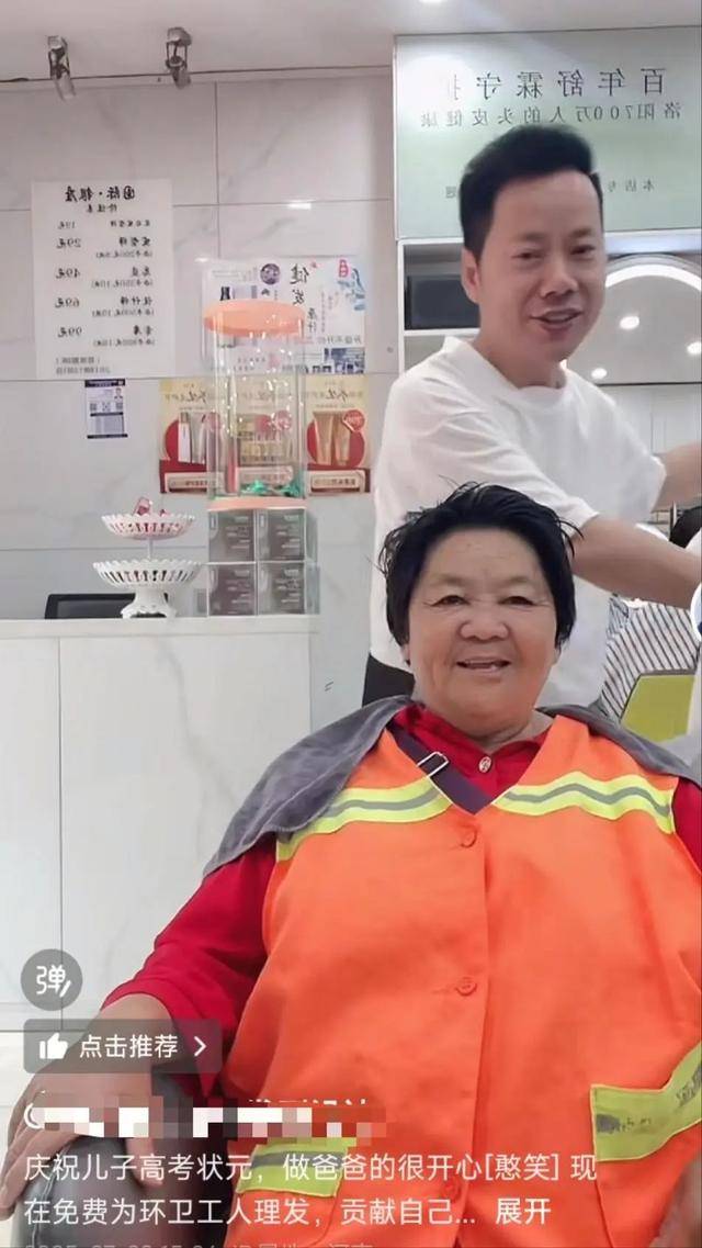 據張先生發布的視頻,其子高考總成績為704分,其中語文130分,數學138分,外語139分,物理、化學、生物學分別為100分、98分、99分,目前已報考清華大學。張先生稱,得知兒子高考成績后,他在自家理發店門前張貼慶祝橫幅,恰好有環衛工人路過觀看,他注意到由于天氣炎熱,環衛工人大多頭發長,滿頭是汗,為幫助他人、回饋社會,他開始發布視頻,稱將義務為環衛工人理發。