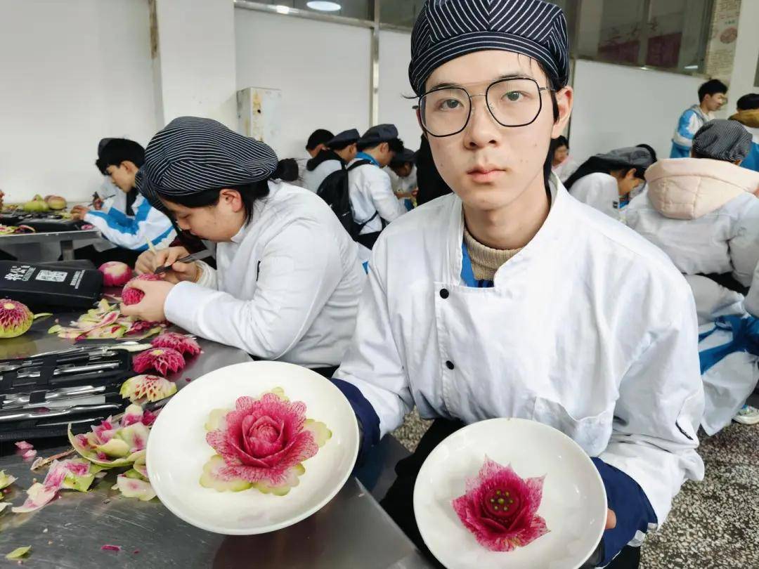 相比全國統一高考,對口高考是指國家為中等職業學校畢業生提供的一種專門升學考試。考試科目包括語、數、外,以及專業理論和專業實操。龔晟參加的烹飪專業考試,理論考試主要是烹飪類知識的筆試,實操考試則包括刀功、面點、雕刻、熱菜4項。其中,雕刻考了雕“荷花”,熱菜考了炒青椒土豆絲。