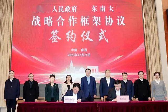 2023年12月24日,東南大學與南通市人民政府簽署戰略合作框架協議。雙方聚焦服務海洋強國戰略深化合作,建好海洋高等研究院等合作載體和項目;攜手推動辦學資質報批、中外合作辦學、政策資金爭取等重點事項落地;要以高品質校區、高品質師資推動產出高品質成果。期間還實地考察了紫瑯科技城、五山及濱江片區、花鳥園片區等處。