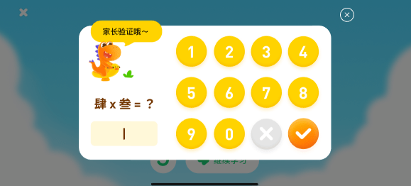 作為教育品牌,瓜瓜龍啟蒙積極響應政策和家長用戶的需求,在行業內率先推出了“APP使用時長管理”功能。為了避免孩子被有趣的動畫和環節所過度吸引,在不影響學習進度的情況下,軟件中可開啟“APP使用時長管理”功能,到達累計時間或次數后即會彈出溫馨提醒,并預留出適當的休息時間。而為了滿足不同家庭的學習需求,家長也可以根據孩子實際的學習時間和習慣來進行調整。到達限制時間后,系統需家長通過答題的方式來進行解鎖,從而獲得新一階段的學習時長。