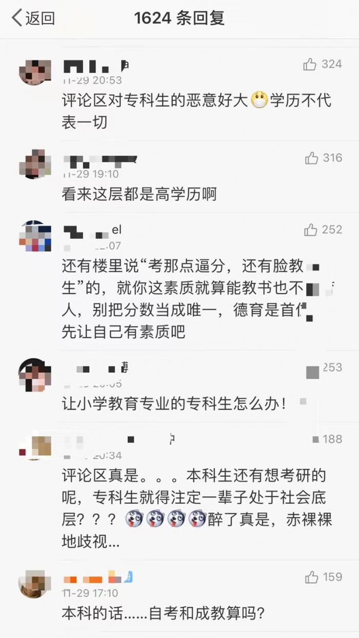 一時(shí)間,征求意見(jiàn)稿在網(wǎng)上引起了截然相反的兩派意見(jiàn),有的認(rèn)為,專(zhuān)科學(xué)歷已經(jīng)滿(mǎn)足不了當(dāng)中小學(xué)教師的要求;更多人認(rèn)為,學(xué)歷不等于素質(zhì),而且由于各地高考分?jǐn)?shù)線(xiàn)不同,有的地方的專(zhuān)科線(xiàn)高于其他地方的本科線(xiàn)。