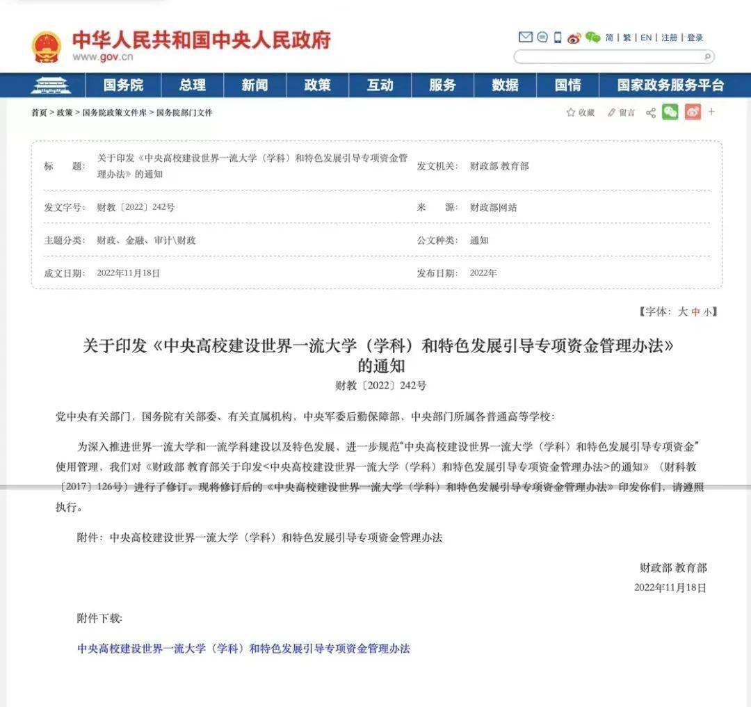 2022年12月9日,中國政府網發布消息:財政部、教育部日前印發通知,制定《中央高校建設世界一流大學(學科)和特色發展引導專項資金管理辦法》(以下簡稱《管理辦法》),擴大高校經費使用自主權。
