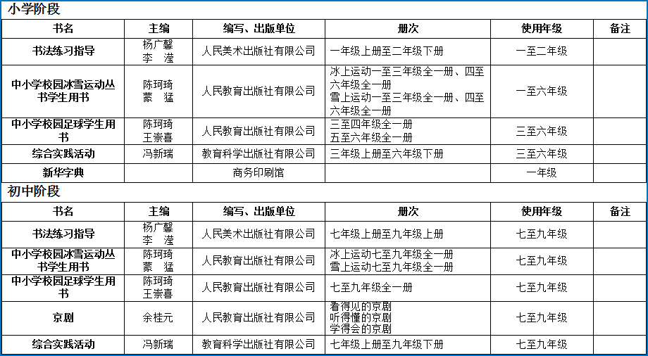 體育運動學校道德與法治、語文使用國家統編教材,其他學科使用《2023年體育運動學校國家課程教學用書目錄》中的教材,或根據教學實際,選擇《2023年義務教育國家課程教學用書目錄》中的教材。
